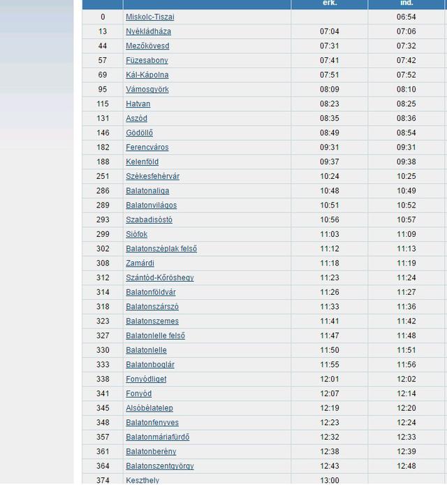 Mivel se a 2 es pótlék, se a vágányzári oldal https://www.mavcsoport.hu/mav-start/belfoldi-utazas/vaganyzar nem tartalmazza se a budapesti se a balatoni, székesfehérvári stb megállásokat, ezért az elvirából kérdeztem le a miskolci balatoni fürdős vonat menetrendjét: