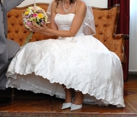 Eladó a képeken látható egyszer használt elegáns, egyszerű de nagyon szép, mutatós menyasszonyi ruha. Hibátlan állapotban, kitisztítva kerül átadásra. 2009 augusztusában üzletből lett vásárolva, nem kölcsönzőből. Kiegészítők: Abroncsos alsószoknya ( nem a ruhába varrott ) Apró kövekkel díszített hímzett kesztyű A ruhát 178cm magas, és 58 kg súlyú menyasszony viselte. Méretei : Mellbőség: 94 cm, Derék: 70 cm, Csípő: 84 cm