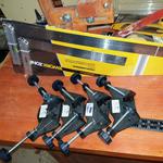 A sarokszorítók öntöttvasból vannak, jó súlyosak, meglepően pontos a derékszög részük, viszont a menetes szárak kicsit kotyogósak, de így legalább nem nehéz tekerni.