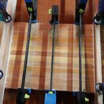 Ezért tegnap este a szálirányú ragasztás/gyalulás után még egyszer felcsíkoztam, most keresztbe hogy elforgatás után bütüvel felfelé nézzen . Csíkozás szépen is sikerült, egyforma széles, egyenes, derékszög aminek annak kell lennie. Nosza ragasszuk össze hogy ma este folytatni tudjam a szélek egyenesre vágásával, végső gyalulás/csiszolás/stb. Ragasztás kész, ugyan sajna kicsit vízszintes irányban elmozdultak a csíkok, de ez még csak esztétikai hiba (én barom csak a síkra koncentráltam, és mire észrevettem úgy összeszorítottam a csíkokat hogy ... de mondom hagyjuk most már így, V 1.0-ás hiba, ettől még vágódeszka lesz, legközelebb ezeket is szorító közé rakom, nemcsak a síkot). Letörölgettem nedves szivaccsal a kinyomódott ragasztót, ami mindenhol szépen egyenletesen jött ki, (ettől jól meg is nyugodtam) majd kb. másfél óra múlva leszedtem a szorítóról és letettem egy sík felületre (ld fent a képet) még teljesen sík állapotban (minimális gyalulás lett volna rajta) ... majd ma este így találtam rá o.O