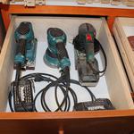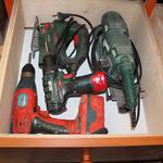 A fiókokhoz nem használtam gyári csúszkát, hanem egy vékony fenyőlécen csúsznak a kimart rétegelt lemez. Némelyik fiókot már tele is pakoltam szerszámmal stb. Abban bízok ez az 5 fiók nagyban hozzájárul majd a műhely rendjéhez.