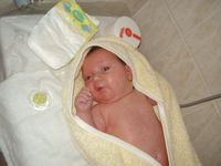 Ami viszont jó hogy 11 v. éjfélkor eszünk utoljára és utána reggel 5 ig alszik és most már napközben is tudom húzni az evés időt így most már riktábban kajál viszont többet szerencsére. És gyönyörű mosolyokat tud küldeni nekünk ha jó kedve van olyankor megkell zabálni. Az első képen pont mosolygott csak mire a fényképező le vette már "csak" ez lett belőle. :))) Párom egy kicsit fáradt úgye az éjszakázástól, de már kezd hozzá szokni és ő is fent éjszaka a babával mert ő büfizteti és teljesen oda van a kicsiért maga mellé teszi és dajkálja szóval el lesz kényeztetve de egyenlőre nem bánom.