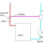 A sztori úgy indult, hogy felújítottunk, bővitettünk, jó 10 éve. Akkor még azt mondták, a radiátorokat 50W/lég m3-rel számoljam. Aztán elkészültünk, bőven elég lett volna 30W/lég m3-rell számolni a radiátorokat. Ha 40 fok fölé fűtöttem a rendszert, nyitott ablakoknál aludtunk, így fojtva járt a kazán. Persze kátrány az jött, a kazán kilukadt, így csréltük. Mivel a visszatérő hűti le az előremenőt, így a visszatérőnek fel kell melegednie. Ideális esetben amennyit hűl az előremenő, annyit melegszik a visszatérő. Egy 35 lemezes hőcserélőt teszek be. Ahogy a képen is van, lesz egy megkerülő ág, ahová egy zónaszelepet teszek, amin egy kapillárcsöves thermofej van, és az méri a hőcserélő után az előremenőt, ha alacsonyabb, akkor a megkerülő ágon több meleget ad, ha meleg, akkor pedig lezár, és a hőcserélő teljes teljesítménnyel dolgozik.