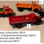 1, Darus IFA G5 (bajszok hiányoznak) - 4.000 forint 2, Billencs IFA G5, zöld - 3.000 forint 3, Billencs IFA G5, narancs (bajszok hiányoznak) - 2.000 forint 4, Platós IFA G5, rakománnyal - 3.000 forint