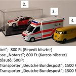 1, Hűtőkonténeres IFA - 5.000 forint/darab 2, Hűtőkonténeres IFA (konténeres ajtóhiányos) - 3.500 forint 3, Emelőkosaras IFA - 7.000 forint 4, Ponyvás IFA (dobozos) - 5.000 forint 5, Ponyvás IFA, katonai - 5.000 forint 6, Postás szett (2 IFA és 1 Barkas) - 12.000 forint