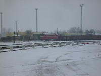 A kéttengelyes kocsikban a Kunszentmártonra feladott szén van, itt aludt egy napot a 4 kocsi a szergejjel együtt. Ne kérdezd meg, hogy miért nem tudták már tegnap este lekapcsolni azt a 4 vagont a rendeltetési állomásán, és utaztatták feleslegesen Kunszentmárton és Szentes között. Egy gyanúm van: szerintem lejárhatott a mozdonyvezető szolgálati ideje, és nem fért volna már bele, hogy Kunszenten lekapcsolják és az ötödik vágányra beállítsák a kocsikat. Ezért lehozták a Szentesre utalt üres Eas kocsikkal együtt, majd másnap 13:10 körüli indulással visszavitték Kunszentre /a 19. répavonattal együtt/, ahol már elvégezték a tolatást.