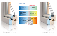 A képen -10 fokos külső hőmérséklet, és +20 fokos szobahőmérséklet mellett vizsgálták az üvegek felületi hőmérsékletét. Ez alapján a komfortbeli különbség a két- és háromrétegű hőszigetelt üvegezés között minimális (igaz, a vizsgált Ug=0,7 W/m2K-es háromrétegű üveg nem épp a legmodernebb; de azt is tegyük hozzá, hogy itthon nem a -10 fokos középhőmérséklet a jellemző).