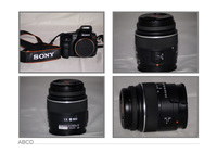 A kisebbik objektív kb. ötször volt használva. A vázon és a nagyobbik objektíven a műanyag részeken használatból eredő karcok, nyomok vannak, de nem befolyásolják a képek minőségét, (LCD is karcos). A nagy objektív napellenzője elveszett. A váz és az objektívek saját dobozukban - a napellenzőt kivéve - minden tartozékával kerülnek értékesítésre. A szett és az akkumulátor is tökéletesen működik!