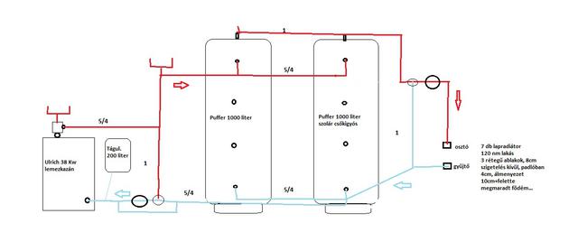 1 köbm puffer, nyitott rendszer, kiegyenlítőnek 120 lit bojlert tettem fel. Kazán és pufi közt 1" vascső.