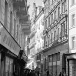 Budapest, V.kerület, Belváros, Só utca - Fővám (Dimitrov) tér sarok a Só utca 2. számú ház (Só u - Váci u. sarok) valameyik emeleti erkélyéről lefelé tekintve