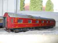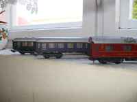 Roco 44665 Amz és Roco 44645 ABmz vörös/sötétszürke kocsik elcserélhetők Roco de újabb színtervű Ampz, ABmz, Bmz kocsikra, vagy Sachsenmodell RZD zöld hálókocsira, CD Bc fekvőhelyes kocsira, ill. CD B fülkéskocsira.
