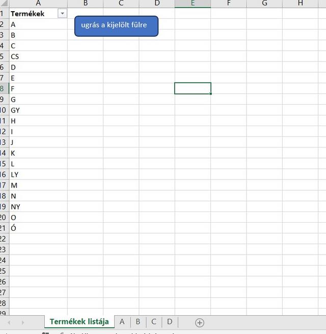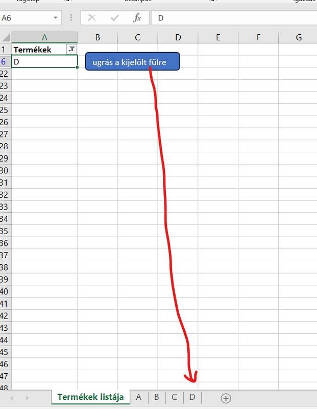 Második kérdés: Ha az "A" oszlopban leszűrűnk egy termékre, akkor a kijelölt = leszűrt termék névhez megfelelő fülre ugordjon az excel (ezt gondolom egy makró gombbal például)