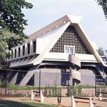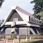 301297 - Szentendrén a mai Római sánc közben a Petzelt József Szakiskola bejáratánál, Szabados Béla szobrászművész, „Festőlány” című szobra (1960)