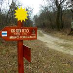 A meglehetősen kopott tábla adatait javaslom fenntartással kezelni, a K+ ui. jelenleg az erdőben kanyarog, a 2,2 km akkor reális, ha az első 1,5 kilométert a most már aszfaltos, de egy jó darabon jelzés nélküli úton tesszük meg.