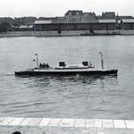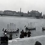 Budapest XI., Budapest IX., budai alsó rakpart a Műegyetem előtt, a westfáliai Hitler-tengerészifjak hajórajának felvonulása a Dunán. A túlparton a Közraktárak épületi láthatók.