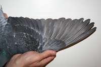 IV, Izomzat, egyensúly, testforma: Legmagasabb pontérték 30. Az izomzatot két helyen vizsgáljuk: Mellizomzatot a mellcsont taraj mentén. Szárnyizomzatot a szárnytőben és a szárnyakon. Az izomzat mennyisége akkor kielégítő, ha tökéletesen takarja a csontozatot, tehát jól fejlett. Az izomzattól minőségileg megköveteljük, hogy minél elasztikusabb /elengedettebb/ legyen. Tapintáskor az izom kötegek kimozdíthatok, azonban tapintás után visszahúzódnak eredeti állapotra. Nem merev, nem löttyedt vagy elzsírosodott. A galamb teste életcéljának megfelelően alakult, A kitartó és gyors repüléshez a legmegfelelőbb az áramvonalas testforma, így ezt mondjuk jó alaknak. A széles mell, a jól íveit hasi rész és az ékszerűen kesŹkenyedő hát-farok alapfeltétele az egyensúlynak és az ideális testŹformának. Ha a galamb e jó tulajdonságokkal rendelkezik a hátsó súlya alig érzékelhető, tehát kézen fekvése jó. A galamb súlyának arányba kell lennie a testnagysággal. Előnyös ha könnyebb súlyú, mint a testnagysága indokolná. Viszont hátrányos ha nehéz, durva testalkatú. Ideális a közepes testnagyság, azonban nem jelent hátrányt ha a közepesnél nagyobb vagy kisebb a galamb teste, ha erőteljes, könnyű és arányos. Egyensúlyhibáról beszélhetünk a túlzottan elhizlalt galambnál, vagy a bírálat előtti túlzott beetetésnél. A bírálat módja: a galambot alapfogásban tartjuk. Egyik kezükkel háŹrom ujjunkkal kitapintjuk a mellizmot. Legcélszerűbb a mellcsonttaraj mentén /az első felében/ vizsgálni. Itt tapinthatók ki legjobban az izomkötegek. A szárny és szárny tőizmokat két ujjunk harapófogószerű átfogásával vizsgáljuk. Előforduló hibák, hiányosságok és értük levonható hibapontok: 1. Nem kifejezetten áramvonalas testforma 0,25-3,00 pont 2. Nehéz, durva test, egyensúlyhiba 0,25-3,00 pont 3. Merev, puha, löttyedt izomzat 0,25-3,00 pont 4. Izomszegénység/fejletlen izomzat/ 0,25-3,00 pont Javasolt pontértékek: 26,00-30,00 pont V. Szárny, tollazat és minősége: Legmagasabb pontérték: 30 A szárnyat két fő részre osztjuk: - elsőrendű evezők - másodrendű evezők A külső szárnyat általában l0 evezőtoll alkotja. Ha számuk ennél több a bírálatnál sem előnyt sem hátrányt nem szenved. Viszont ha 10-nél kevesebb, feltétlen büntetendő. A belső szárny tollainak száma nem lényeges, viszont követelmény, hogy a külső szárnnyal együtt megfelelő nagyságú és alakú szárnyfeŹlületet képezzenek. Mik ezek az alaki és nagysági minőségi követelmények? A szárnyfelület kiterjesztett állapotban arányos nagyságú legyen a galamb testnagyságával és súlyával, a szárnyfelület kiterjesztett állaŹpotban, arányosan normái fesztávolságra nyitva, törésmentes egyenes vonalba fusson a test tengelyére. Az evezőtollak legyenek jól fejlettek, minél hosszabbak, egymást tökéletesen takarják. Az evezőtollak végeiken jól lekerekítettek, csévéjük repedéstől mentes, fénylő, rugalmas. Az elsőrendű evezők közül a 10-es /legszélső/ nem lehet rövidebb a 8-asnál. Ha rövidebb akkor büntetendő. Előnyös, ha a szélső három vagy kettő azonos hosszúságú. Mind a külső, mind a belső szárnytollak alsó részét takarótollak borítják. Megkövetelendő, hogy jól fejlettek legyenek és az evezőket tökéletesen takarják. Vizsgálandó a felkar és alkar aránya. Előnyös, ha a felkar rövid és erős, az alkar pedig hosszú. A szárnytollak minőségének vizsgálata egybeolvad a tollazat minőségének vizsgálatával. A galamb tollazatának gazdagnak, finomnak és rugalmasnak kell lennie. A testhez szorosan simuljon. Fénylő és jól púderozott legyen, melyet szigorúan kell vizsgálni. Bírálat módja: a galambot egyik kezünkbe fogva a másik kezünk hüvelykŹujját a szárny lapjára fektetjük. A három középső ujjunkkal a szárny alá helyezzük, míg a kisujjunkkal megtámasztjuk a szárnyat, majd normál fesztávra nyitjuk. Ebben a fogásban nagysági és alaki vizsgálatot végŹzünk. Ezután a szárnyat visszaengedjük nyugalmi állapotba, de kezünk fogásában marad. Hüvelykujjunkkal végigsimítjuk a szárny felső lapját. Itt tudjuk ugyanis legbiztosabban megállapítani a tollazat finomságát, selymességét, tömörségét.