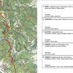 Másik példa, az igazolófüzet egy oldalán bemutatva: bal oldalt a színes térképen jelölve az útvonal a falvakkal és az igazolópontok helyével és számával, jobb oldalon pedig a pecsétetek és opís textek helye. Az eredeti füzet amúgy A5-ösnél kisebb méretű. Mindegyik igazolópontnál szokott lenni egy egy-két mondatos kommentár.