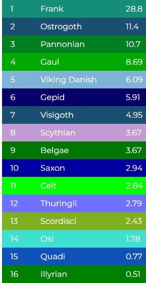 Szívesen. A nagy cégek a mai népességre adják meg az etnikai becslést. A MyTrueAncestry ad régi népekre becslést, ha feltöltöd más cég autoszomális tesztjét az oldalukra, de ezt nem nevezném teljesen pontosnak, inkább irányjelzés általában, ha mondjuk az izlandi viking jön ki az egyik civilizációnak, az csak azt jelzi hogy germán őseid voltak, van azért ami pontos náluk, például a korai szláv vagy a kijevi Rusz, jól mutatja a szláv ősöket. Ilyen most az én etnikai összetételem most náluk.