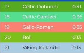 Gepid + Kievan Rus (3.634) Scythian + Ostrogoth (6.696) Ostrogoth + Early Slav (6.782)