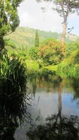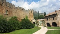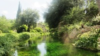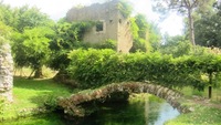 Leírhatatlanul hangulatos, ahogyan a folyóval-patakokkal parcellázott területen a középkori falu maradványait megtekintjük: futórózsákkal díszes romos boltívek mellett, színes virágmezőkkel tarkított kertrészek, levendulával szegélyezett sétányok, banán- tölgy nyár-valamint juharfák és ciprusok és bambuszerdő között haladunk. Látni lehet itt még több színben pompázó futórózsákat, lila Clematist, lila-akácot, japán csüngő-akácot, jázmint és a mediterrán virágok tarka pompáját… Nem maradhatnak el a ciprusfélék, cédrusok és a magnolia sem. A freskókkal díszített templom fala a szabad ég alatt -kitéve az időjárási hatásoknak- is őriz valamennyit a díszítésből. Csodálatos összhang és békés légkör leng körül mindent.