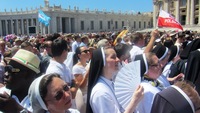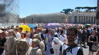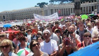 Nagy a tömeg, és hatalmas várakozás előzi meg a szentatya megjelenését, aki jó erőben van, de lényegesen fáradtabb, mint amilyennek egy fél évvel ezelőtt láttam. Bonnitát a jól megadott koordináták alapján azonnal megtalálom, így együtt éljük át azt a csodálatos egységet, és végtelen szeretetet, ami körüllengi a teret.