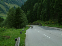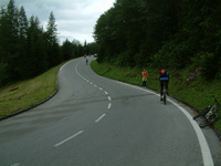 a sok emelkedőről eszembe jutott a nyári ausztriai tekerés. a fő cél feltekerni a Glockner-hágóra(remélem jól írtam). Azt hiszem örök emlék fog maradni. 12km felfele, talán kétszer volt száz méternyi vizszíntes, a szintemelkedés olyan 1500m körül volt. kb fél úton elkezdett szakadni az eső, majd havaseső :) nagyon vártam már hogy felérjünk a kitűzött célig, egy nagy túristaházig. sanci már fent volt vagy fél órája, mire felértünk. kis pihenés után szétváltunk, a csajok egy sráccal visszamentek a kocsihoz, én meg sancival tovább. először jó nagy lejtő, amin muszáj volt fékeznem végig, mert a vizes ruha rámfagyott volna a menetszéltől. na de aztán jött ismét a feketeleves, újra felfele, de brutál mód. volt olyan hajtűkanyar amit vagy 30 fokban bedöntöttek a nagy szintemelkedés(de inkább a fentről jövő autók miatt, hogy a centrifugális erő ne vágja le őket az útról) miatt. na ott már én is leszáltam pihenni egy kicsit mert már kezdett görcsölni a lábam :) olyan 20xx méter magasságig mentünk fel, sajnos nem jut eszembe a neve(valami Hoch....). Onnan szinte végig lefele volt a hágó sorompójáig.