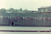 Szerintem XIII., Kámfor utca, a vasúti átjárótól néhány lépésre. Persze a kerítés mögötti épületegyüttest lebontották már, de a lelkesítő felirat még jóval a rendszerváltás után is kikandikált.