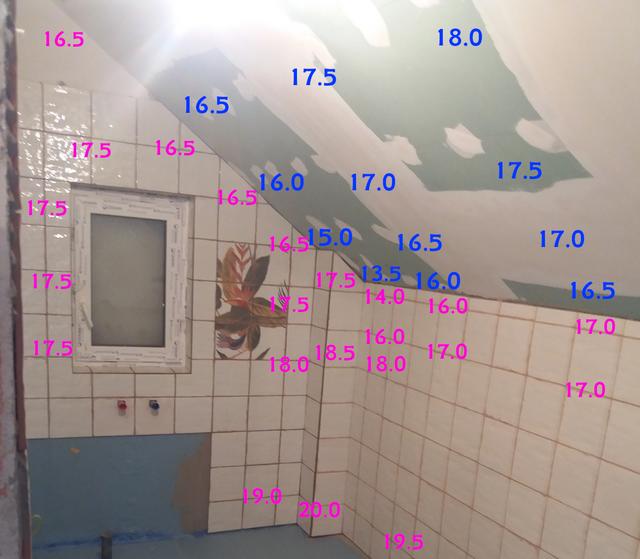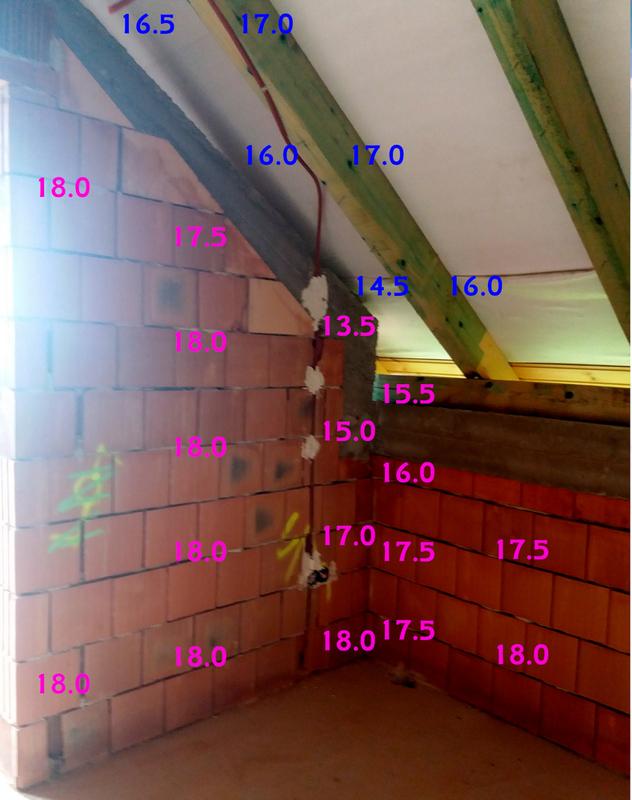 Egy "Black & Decker Thermal Leak Detector" eszközzel megmértem a fal és a tető hőmérsékletét a penészedés környékén (a kinti hőmérséklet 0 C körüli). A képen C fokban a felület hőmérséklete. Csatolok az építkezés korábbi szakaszáról is képeket.