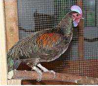 Csupasz, fűrészesen kivágott, a tragopánokéra emlékeztető taraj, a csőr tövén ülő és lelógó bőrlebeny jellemzi.