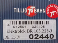 Eladó Tillig-Beckmann TT BR 103. 228-3-as DB IV-es korszakbeli villanymozdony. Teljesen új, karcolásmentes állapotban, csak próbálva volt. Eredeti dobozában, papírjaival, és bontatlan kiegészítőivel. Cikkszáma 02440.