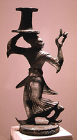 Nude kouros in dancing pose. Finial of a candelabrum or a kottabos stand. Tangs project from the feet and are encrusted with lead. The body is deep green with a lighter green patina on arms.