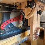 - az egész maróasztal modult úgy rögzítettem a fűrészgépre, hogy a kihúzható és így szétváló asztalrészek oldalaira szereltem fel 1-1 rétegeltlemez csíkot csavarokkal. A rétegelt lemezkbe nagyobb a furat, mint a csavar, így van állítási lehetőség is. Szépen szintbe lehet állítani mindent.