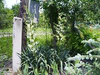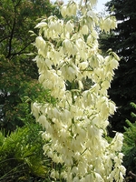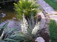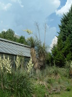 Sziasztok!Nálam a filimentosa van teljes virágpompában.A legmagasabb virágszár 2,7 méter magas,ekkorát még soha nem láttam.Kb. egy hete a vihar tövestül kiforditotta a földből,azóta egy mellé leütött vaskaróhoz kikötve virágzik.Szintén idei,de korábbi kép a kék bogyós yukkáról.