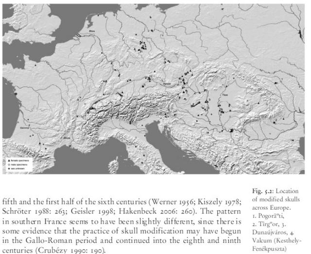 These skulls have long been interpreted as primary evidence for the Hunnic migrations into Europe. The practice of skull modification is thought to have originated in the central Eurasian steppes in the first century a d and to have been brought to central Europe with the Huns and other nomadic peoples (see Werner 1956;Kiszely