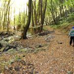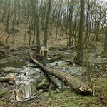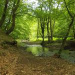 Kék, vagy zöld jelzésű útvonal, nekem gyertyánnak tűnő a fák, időszakosan erős sodrású patakvölgy, amely mentén közvetlenül autóval is el lehet menni, közelben valószínűleg kőfejtő, minden bizonnyal andezit, esetleg bazalt kőzettel.