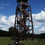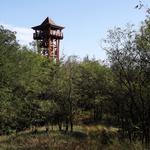 Az errefelé megszokott homokos úton ballagtunk, de nem volt túlságosan süppedős, mert elég sok eső esett az előző hétvégén ezen a környéken, a víz pedig kissé betömörítette a talajt, csak a ritkásan azért előforduló tócsákat kellett kerülgetnünk. Már láttam, nem volt rossz ötlet most túrára indulni, egyrészt elmúlt erre a hétre a nyári kánikula, meg az eső is jót tett az utaknak! Homokos utakon, keréknyomokon ballagtunk a Hármas-hegy lábáig, itt egy vadiúj irtásfolt mellett eloldalazva felkaptattunk a dombgerincre és egy gyalogösvényen végighullámvasutaztunk a tetők között. Feltűnt előttünk egy magasabb csúcson az impozáns kilátó, pár perc alatt fel is kapaszkodtunk odáig.