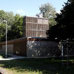 Nyírlugos - Az óvoda és teleház épülete mögött a katolikus templom is feltűnik