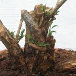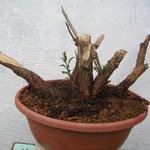 Goji bonsai project. Lehet hogy egy kicsit nagyképű ez a kifejezés arra amibe belekezdtem de nem baj. :D Április elején autózás közben felfigyeltem arra hogy az út menti vadon nőtt bokrokat valamikor a télen erősen, a talaj szintig visszavágták. Megálltam felmérni a terepet, talán akad érdekes yamadori alapanyag amit majd ősszel kiszedhetnék. Felfigyeltem egy lícium tőre (Lycium barbarum) - ez egy annyira közönséges növény hogy szinte észre sem vesszük. Törzset rosszul nevel, az ágai lehajlók, ráadásul tüskések is, a virágai aprók de szép piros bogyókat hoz és rendkívül élelmes, szívós növény. A bogyóit (és a Lycium chinense bogyóit szintén) goji bogyó néven gyógyhatásúnak tartják. Az én felfedezett növénycsonkomat sikerült szerszám nélkül kitörnöm és kiszednem a vastag avarból. Alig volt gyökere és egyetlen fényhiányos hajtása indult. Így nézett ki amikor hazahoztam: