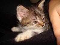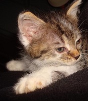 Este, az utcán meglátott, és én csak arra lettem figyelmes, hogy egy a semmiből feltűnő, pöttöm szőrmók száguld felém nyávogva, egyenesen a karjaimba - segítséget kérve. Hatalmas szerencséje volt. Vizes volt, saras, és náthás, de legalább valaki még épp időben érkezett. Az első napokban sokat kellett küzdenie, de stramm kiscica lévén hamar felépült, és mostanra már egy egészséges, erőtől kicsattanó, kiegyensúlyozott, problémamentes, játékos, és leírhatatlanul hálás, dorombolós, ember-függő Drágaság, aki nagyon közel került a szívemhez. Ő egy rendkívül értelmes, intelligens, belevaló kislány, akinek a hite mindig töretlen. Más cica, kutya, kisgyerek mellé is örökbe fogadható. Ivartalanítva, chipezve, parazitamentesítve adom oda szerető, leendő gazdájának ezt a tüneményes, és nem mellesleg gyönyörű kislányt.