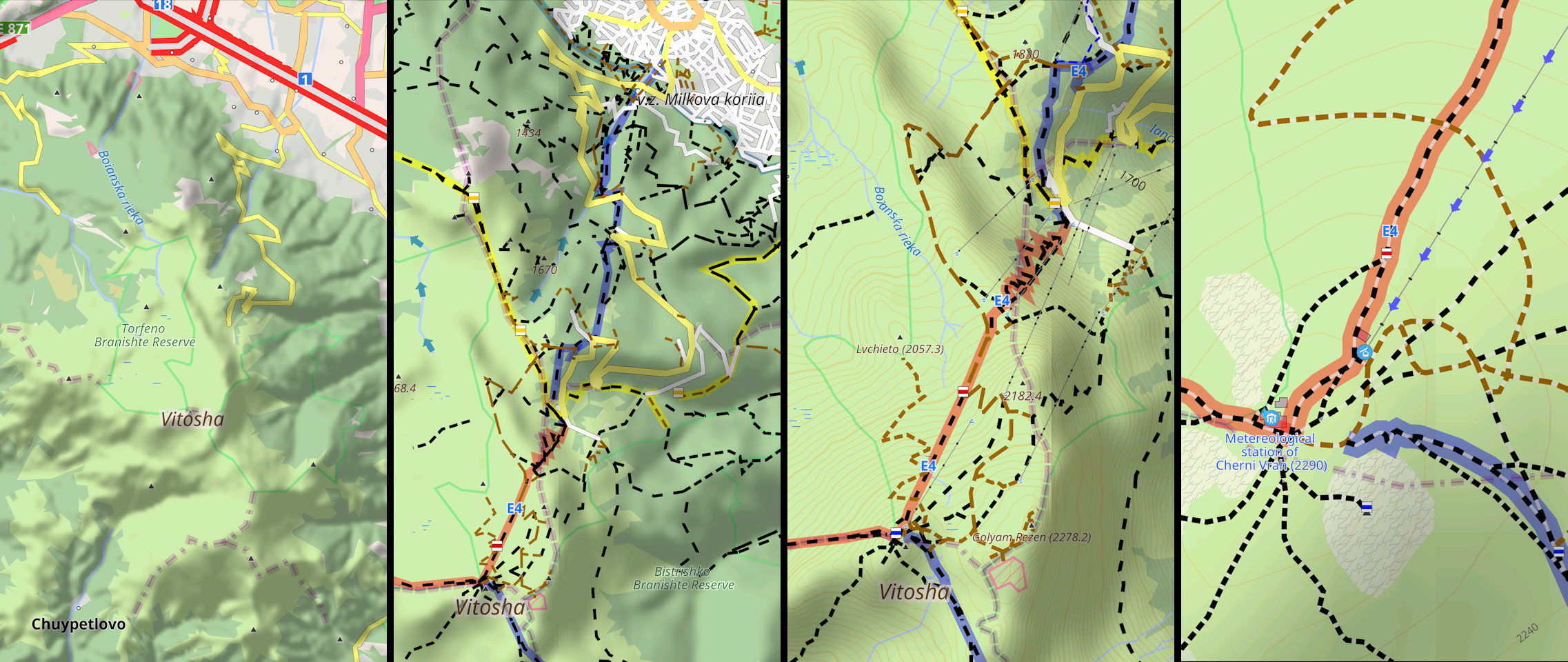 Én Bulgáriában is az OpenStreetMap alapú androidos OSMAnd+ programot használom túrán is. Az OpenStreetMap alatt árnyalt domborzat és szintvonalak, színekkel és jelzéssel kiemelt turistautak (azt nem tudom, az ingyenes verzióban mely opciók vannak feloldva). Néha teszek alá műholdképes alátéttérképet. Mindez teljesen offline, hegyek közt nem bízhatom magam a térerőre.