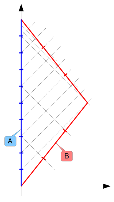 Ez szintén egyszerű magyarázat volt, amely nélkülözte a Lorentz transzformációt, és semmi mást nem használtunk fel benne, csak ami látszik a rajzon. Ez azért érdekes, mert nem kötöttem ki, hogy a fénysebesség mindenki számára ugyanakkora!!! A rajz A inerciarendszerében ábrázolja az eseményeket, és ebből már adódik, hogy B számára másként telik az idő. Ha ezek után azt kezdem el firtatni, vajon B hogyan ábrázolná ezen eseményeket a távolodó inerciarendszerében, akkor kerül csak felszínre a relativitás elve, és ennek kapcsán annak kimondása, hogy a fénysebesség mindenki számára ugyanakkora.