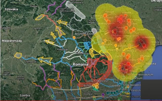 A szerző megkérte Attilát (valószínűleg TA-t), hogy súlyozza a különböző lelőhelyeket (moldáviai, román cikkek, fémkeresős szorványleletek), így alakult ki ez a 3 göc (törzsi központ?) valami matematikai "trükközéssel", plusz látszanak a hágócsoportok. A románvásári fémkeresős leletek utalnak a legközelebbi hágók használatára.