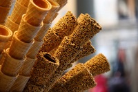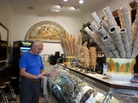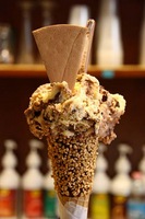 Sajnos azt nem tudom.Igazság szerint nekünk először az a nagy csokis, kókuszos tölcsér tünt fel.Úgy gondoltuk abba kérünk egy gombóc fagyit. Csak később - amikor az árus csak rakta, és rakta a lapátjával a fagyit - jutott eszünkbe, hogy az olaszok nem használják a nálunk ismeretes ( lehúzós) gombóc adagolót. Mire észbe kaptunk, csak fizetni kellett, és birkózni azzal az óriás tölcsérrel, és a benne, rajta, körülötte lévő hideg finomsággal.