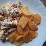 Ma rántott csirke, burgonya röszti, paradicsomsaláta lilahagymával és mozarellával.