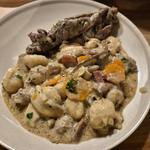 vajon es olajon csaszarszalonnat piritottam. az elotte borsozott es sozott vadnyulcombokat ratettem, egyutt pirongattam. szortam ra kakukkfuvet, majd egy fej hagymat, 3 gerezd fokhagymat, egy repat, fel feherrepat karikazva radobtam, piritottam. kozben soztam, borsoztam. felontottem 2 deci szaraz feherborra es annyi vizzel, hogy majdnem ellepje. lefedtem, kb 80 percig lassu langon foztem. tulajdonkeppen puhulasig kell fozni. kozben felszeleteltem kb 80 dekanyi friss erdei gombat (varganya, rizike, gereben), majd radobtam. itt nem kell ra viz, mert a gomba kiad majd magabol. kb 15 percet foztem, kozben ellenoriztem, utanaallitottam a sonak, borsnak. ezutan kb 2 deci tejfollel, egy pupos evokanal mustarral habarast csinaltam, belekevertem. felbontottam egy doboz gnochit, beleontottem, puhara foztem. a legvegen egy marek petrezselymet tettem ra. hm, most csak ugyesen nezek ki a fejembol.