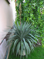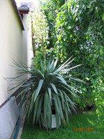 Szépen nő a jukkád, jövőre nagyon be fog indulna. Esetleg idén védelemnek tegyél a tetejére egy darab fóliát, úgy, hogy csak a közepét védje, oldalt alul ne legyen fólia, mert megfullad. Én az elmúlt teleken nem védtem, de a tavalyi sérülése miatt idén fogom, a képen látszik, hogy vastag drótből (feszítődrót) meg vékonyabb vasból kupolát kapott, csak a tetejére fogok fóliát tenni, esetleg az észak-nyugati oldalra, mert onnan szokott fújni a szél. Lehet még fátyolfóliával is takarni, az szellőzik.