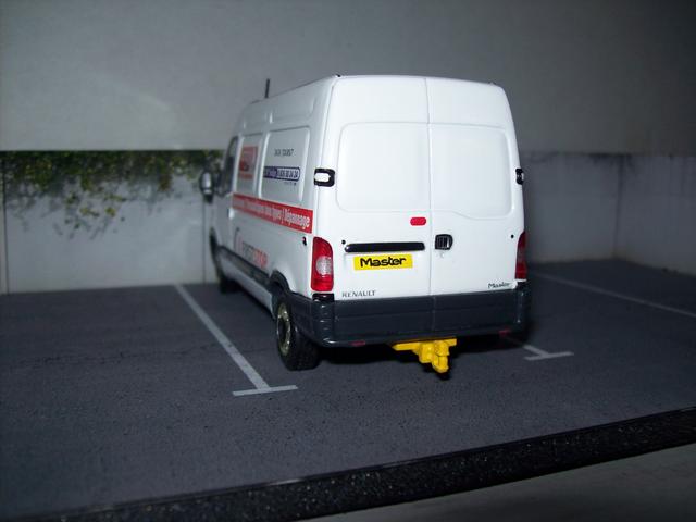 Hátul szép formára kialakított lámpák ahogy kell, természetesen az irányjelző-tolató rész meghagyásával. Itt is megkapta a figyelemfelhívó mintázatot, valamint egy fekete-rácsozott festést is kapott az üveg helyére. Azonkívül rendszámtakaró elemet és a kilincsfestést is megkapta, ahogy oldalra a felfogó ütköző bütyköt is. Rendszám is került rá - természetesen figyelve rá hogy itt már sárga alapon legyen - és megkapta a Renault, jobb oldalra a Master feliratokat és még az EDF-GDF Services feliratot is. Fentre a tetejére kapott egy két létrás tárolót elől egy kék villogóval, ami kissé fakó - talán majd tudok rajta segíteni - valamint hátul egy útépítést imitáló táblát, lentre pedig a lökösbe megkapta a két piros prizma kialakítást. Egyedüli pici hibája talán az, hogy a hátsó ajtón a figyelemfelhívó mintázaton pirosnak kéne lennie a kis vízszintes féklámpa csíknak, nem pedig feketének. A kis külön fel-le vehető vonószem, már csak hab a tortánt :D