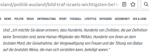 Info: most 4-en az israeli hadügyminiszter több orszagnak az ujsagiroinak adott egy interjut (lennt a bild de erröl az adott interjurol szolo tegnapi > nov. 4.-i cikkröl monitorkepei is erröl), es külön kiemelte a hadügyminiszter azt az ujsagiroknak, hogy a Gazastreifenben levö Hamas terroristak elleni >akik az okt. 7.-i meszarlast-gyilkolaszast civilek ellen elkövettek < >>> fegyveres reakciora valo a parancs kiadassal kapcsolatban nagyon fontos az, hogy a Gazastreifenben elö arab-iszlam vallasuak/palesztinok a Hamast valasztason megvalasztottak. (Tehat a Hamas terrorszervezetet senki sem eröltette ra az ott elökre, ezt a Hamast az ott elök valasztason sajat maguk maguknak megvalasztottak.)