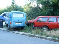 A Jawa Mustang nem tudom, hogy pusztul-e, a Trabant udvarán ál. A Skoda + VW Passat, T2 a Trabantos udvar elött áll. A Bogár szintén hozzájuk tartozik. (múltkori fotóm óta kicsit zöldebb lett a környéke) Az udvaros kép a Trabant melletti telek. A Ford Escort pedig átkerült a szomszéd oldalra.