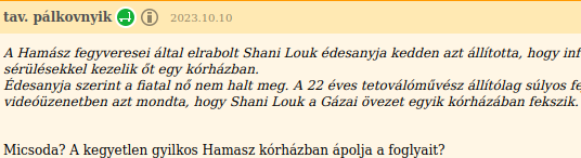 Vagyis akkor sziren – pidor - kancápa kancája - tenno - kuvasz- stb nickekkel is iro a tav. Palkovnyik nickedden Te tudatosan hazudtal, amikor Te azt allitottad hogy a lanyt a Hamas terrorszervezet a Gazastreifenen belül egy korhazban apoltatja, hiszen a lany akkor mar amikor a platon vittek es a hamas terroristak közbe mutogattak Gaza varosaban, < akkor mar halott volt, es ezt Te tudtad oszt megis mast hazudtal be >